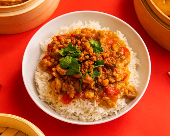 Tender chicken that is cooked in a sweet and spicy sichuan chili-soy sauce, served on jasmine white rice.